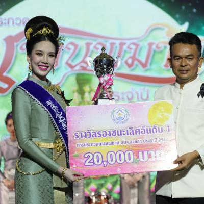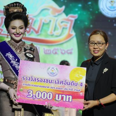 โอกาสนี้ นายอภิชัย เกื้อก่อบุญ รองปลัดองค์การบริหารส่วนจังหวัดสงขลา ได้ให้เกียรติมอบมงกุฏ สายสะพาย และเงินรางวัลแก่ นางสาวฐิตาภา มุสิกนันท์ หมายเลข 10 ผู้ชนะเลิศการประกวดนางนพมาศ อบจ.สงขลา ประจำปี 2568 พร้อมด้วย นายโยธิน ทองเนื้อแข็ง สมาชิกสภาองค์การบริหารส่วนจังหวัดสงขลา เขตอำเภอกระแสสินธุ์ และคณะกรรมการตัดสิน