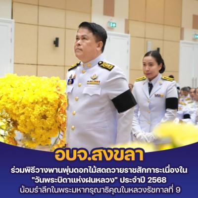 อบจ.สงขลา ร่วมพิธีวางพานพุ่มดอกไม้สดถวายราชสักการะเนื่องใน "วันพระบิดาแห่งฝนหลวง" ประจำปี 2568 น้อมรำลึกในพระมหากรุณาธิคุณในหลวงรัชกาลที่ 9