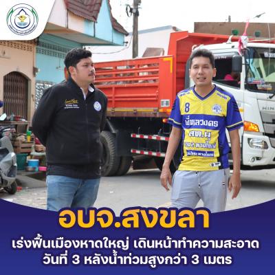 อบจ.สงขลา ลุยฟื้นฟูหาดใหญ่วันที่ 3 ระดมเครื่องจักร–เจ้าหน้าที่ เก็บกวาดพื้นที่หลังน้ำลด
