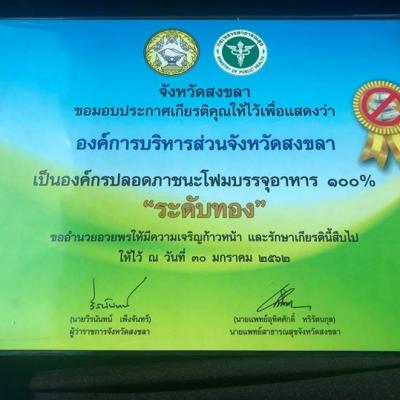วันพุธที่ 30 มกราคม 2562 นายวีรนันทน์ เพ็งจันทร์ ผู้ว่าราชการจังหวัดสงขลา เป็นประธานมอบประกาศเกียรติคุณ โดยนายสมหมาย ขวัญทองยิ้ม รองนายกองค์การบริหารส่วนจังหวัดสงขลา ขึ้นรับรางวัลประกาศเกียรติคุณ "องค์กรปลอดภาชนะโฟมบรรจุอาหาร 100% ระดับทอง " ประจำปี 2561 ในโอกาสประชุมหัวหน้าส่วนราชการ ประจำเดือนมกราคม 2562 พร้อมขับเคลื่อนกิจกรรมรณรงค์ลด ละ เลิก การใช้โฟมมาอย่างต่อเนื่องเพื่อเป็นการคุ้มครองผู้บริโภคและลดปัญหาสิ่งแวดล้อมจากขยะโฟมและพลาสติก ซึ่งสอดรับกับ 12 ประเด็นวาระพัฒนาจังหวัดสงขลา ปี 2562 ในวาระสงขลาเมืองสะอาด