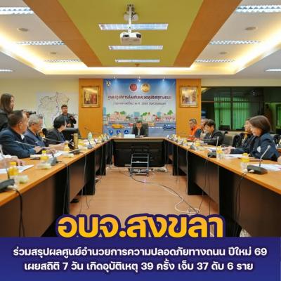 อบจ.สงขลา ร่วมสรุปผลศูนย์อำนวยการความปลอดภัยทางถนน (ศปถ.) ปีใหม่ 69 เผยสถิติ 7 วัน เกิดอุบัติเหตุ 39 ครั้ง เจ็บ 37 ดับ 6 ราย