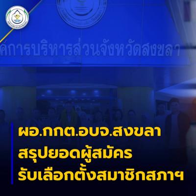 ซึ่งตลอดระยะเวลาการรับสมัครมีผู้ประสงค์จะรับสมัครรับเลือกตั้งสมาชิกสภาองค์การบริหารส่วนจังหวัดสงขลา (แทนตำแหน่งที่ว่าง) เขตเลือกตั้งที่ 1 อำเภอกระแสสินธุ์ จำนวน 4 ราย ได้แก่ 1.นางสาวกันย์ลภัส โรจนะหัสดิน 2.นายสุธน หนูสังข์ 3.นายทักษิณ เครือแก้ว และ 4.นายณรงค์ ไชยสาลี และเขตเลือกตั้งที่ 2 อำเภอสะบ้าย้อย จำนวน 2 คน ได้แก่ 1.นายฟูรกรณ์ เจะแม และ 2.นายฮามิ ดอเลาะ รวมจำนวนผู้ประสงค์จะรับสมัครรับเลือกตั้งสมาชิกสภาองค์การบริหารส่วนจังหวัดสงขลา (แทนตำแหน่งที่ว่าง) จำนวน 6 ราย