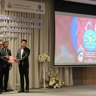 วันที่ 5 มีนาคม 2569 นางสุรียพรรณ์ ณ สงขลา รองนายกองค์การบริหารส่วนจังหวัดสงขลา ร่วมงานเสวนาและเปิดตัวหนังสือ "250 ปี วิถีมังกร ริมทะเลสาบสงขลา" จัดโดย มูลนิธิสงขลาสู่มรดกโลก โดยมี นายรัฐศาสตร์ ชิดชู ผู้ว่าราชการจังหวัดสงขลา เป็นประธาน นายจารุวัฒน์ เกลี้ยงเกลา ประธานกรรมการมูลนิธิสงขลาสู่มรดกโลก กล่าวรายงาน พร้อมด้วย คณะกรรมการมูลนิธิฯ หัวหน้าส่วนราชการ และได้รับเกียรติจาก นายวัง จื้อเจียน กงสุลใหญ่แห่งสาธารณรัฐประชาชนจีนประจำจังหวัดสงขลา ผู้แทนภาคเอกชน ภาคประชาชน เข้าร่วม ณ ห้องควีน เอ โรงแรมลากูน่า แกรนด์โฮเทล แอนด์ สปา สงขลา ตำบลพะวง อำเภอเมืองสงขลา จังหวัดสงขลา