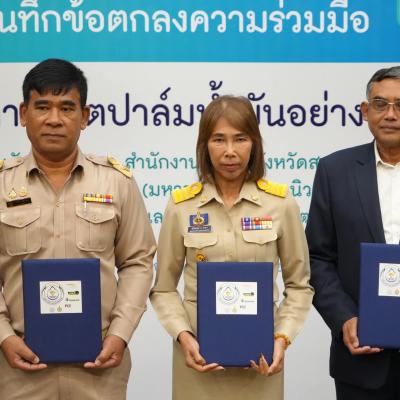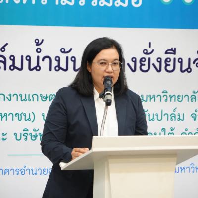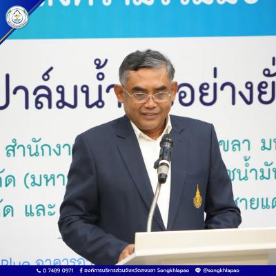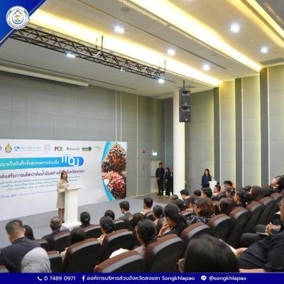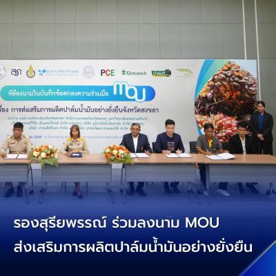 นางสุรียพรรณ์ ณ สงขลา รองนายกองค์การบริหารส่วนจังหวัดสงขลา ร่วมพิธีลงนามในบันทึกข้อตกลงความร่วมมือ MOU เรื่อง การส่งเสริมการผลิตปาล์มน้ำมันอย่างยั่งยืนจังหวัดสงขลา ระหว่างองค์การบริหารส่วนจังหวัดสงขลา สำนักงานเกษตรจังหวัดสงขลามหาวิทยาลัยสงขลานครินทร์ บริษัทเพชรศรีวิชัย เอ็นเตอร์ไพรส์ จำกัด (มหาชน) บริษัทยูนิวานิชน้ำมันปาล์ม จำกัด (มหาชน) บริษัท ปาล์มดีศรีนคร จำกัด (มหาชน) และบริษัทปาล์มพัฒนาชายแดนใต้จำกัด พร้อมด้วย นายอภิชัย เกื้อก่อบุญ รองปลัดององค์การบริหารส่วนจังหวัดสงขลา ร่วมเป็นเกียรติในพิธีลงนาม โดยมี รองศาสตราจารย์ ดร.เบญจมาภรณ์ พิมพา หัวหน้าโครงการวิจัยด้านการขยายผลพัฒนาการผลิตปาล์มน้ำมันอย่างยั่งยืนแบบบูรณาการ กล่าวรายงาน