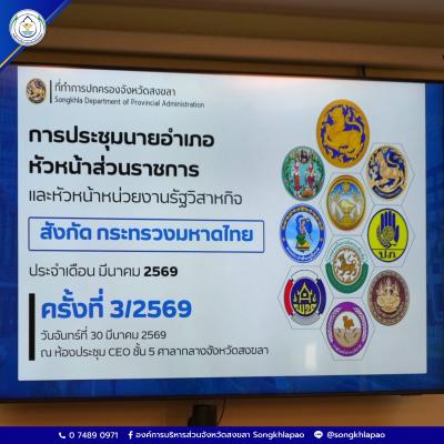 วันที่ 30 มีนาคม 2569 นายรัฐศาสตร์ ชิดชู ผู้ว่าราชการจังหวัดสงขลา เป็นประธานการประชุมนายอำเภอ หัวหน้าส่วนราชการ และหัวหน้าหน่วยงานรัฐวิสาหกิจ สังกัดกระทรวงมหาดไทย ครั้งที่ 3/2569 ประจำเดือนมีนาคม 2569 โดย นายสุพิศ พิทักษ์ธรรม นายกองค์การบริหารส่วนจังหวัดสงขลา มอบหมายให้ นายอภิชัย เกื้อก่อบุญ รองปลัดองค์การบริหารส่วนจังหวัดสงขลา เข้าร่วม ณ ห้องประชุม CEO ชั้น 5 ศาลากลางจังหวัดสงขลา ตำบลบ่อยาง อำเภอเมืองสงขลา จังหวัดสงขลา
